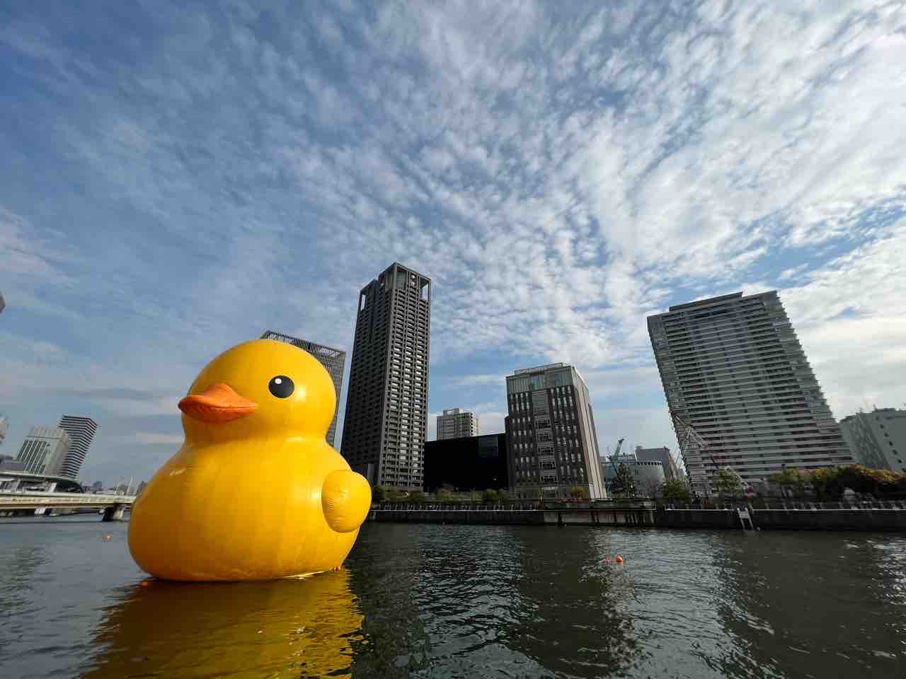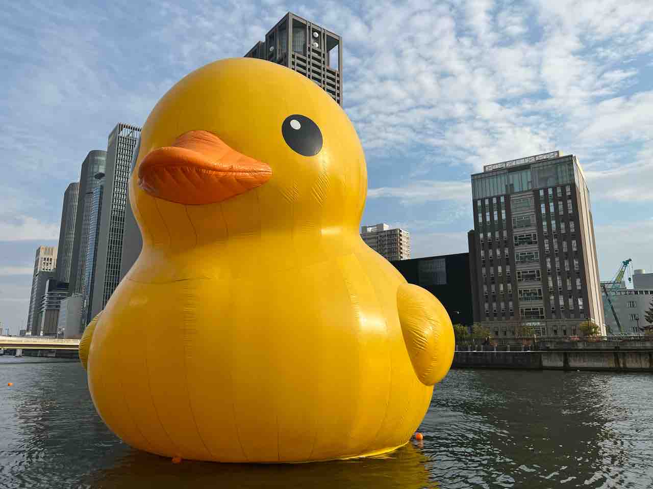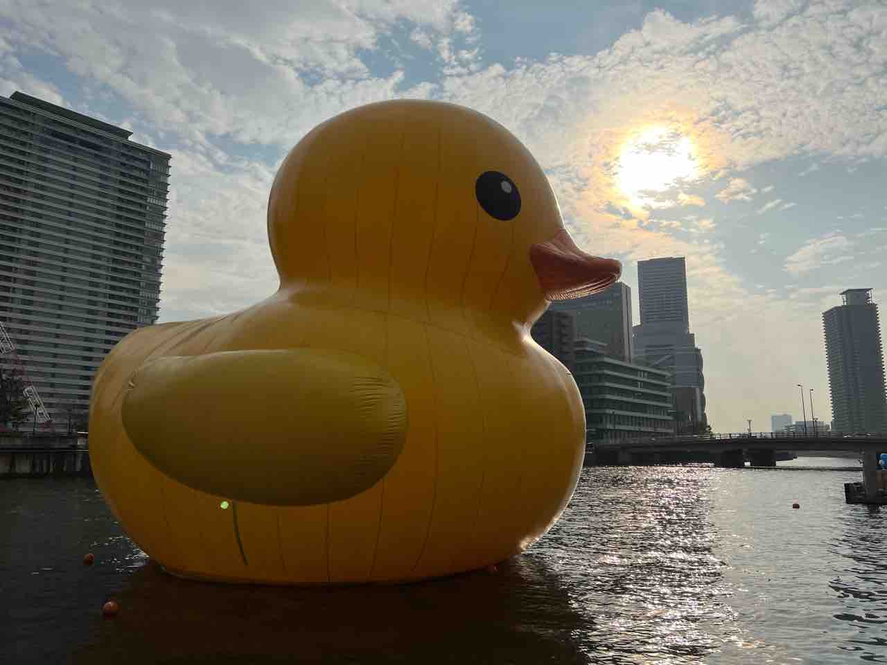 目の前まで近づくと想像以上に巨大なアヒル「ラバー・ダック」が都会の川に浮かんでいるではありませんか!