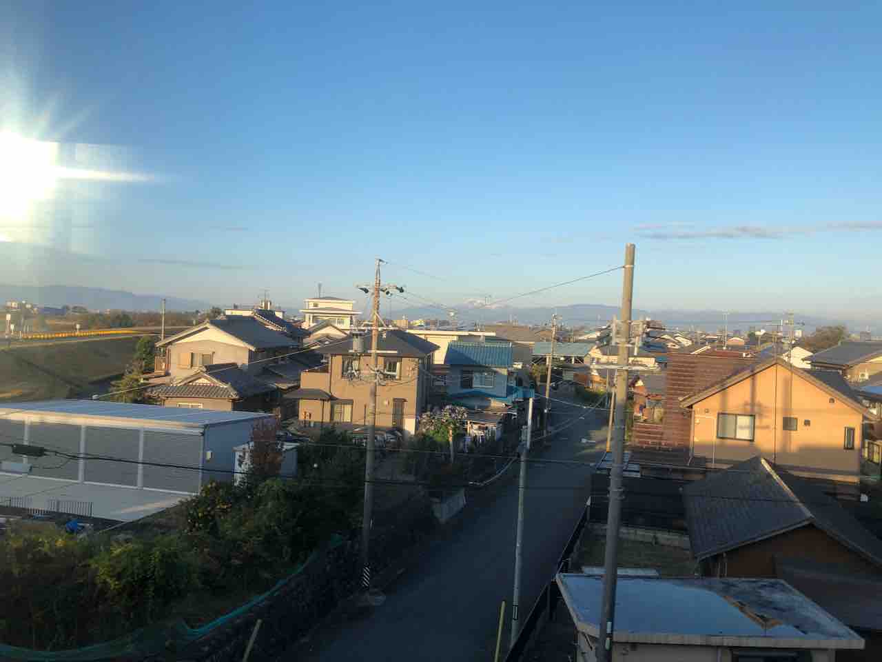 早速名古屋も飛ばして岐阜の手前です。奥のほうに雪が積もった山が見えますね 間違っていると思いますが、養老山地か伊吹山の方でしょうか?